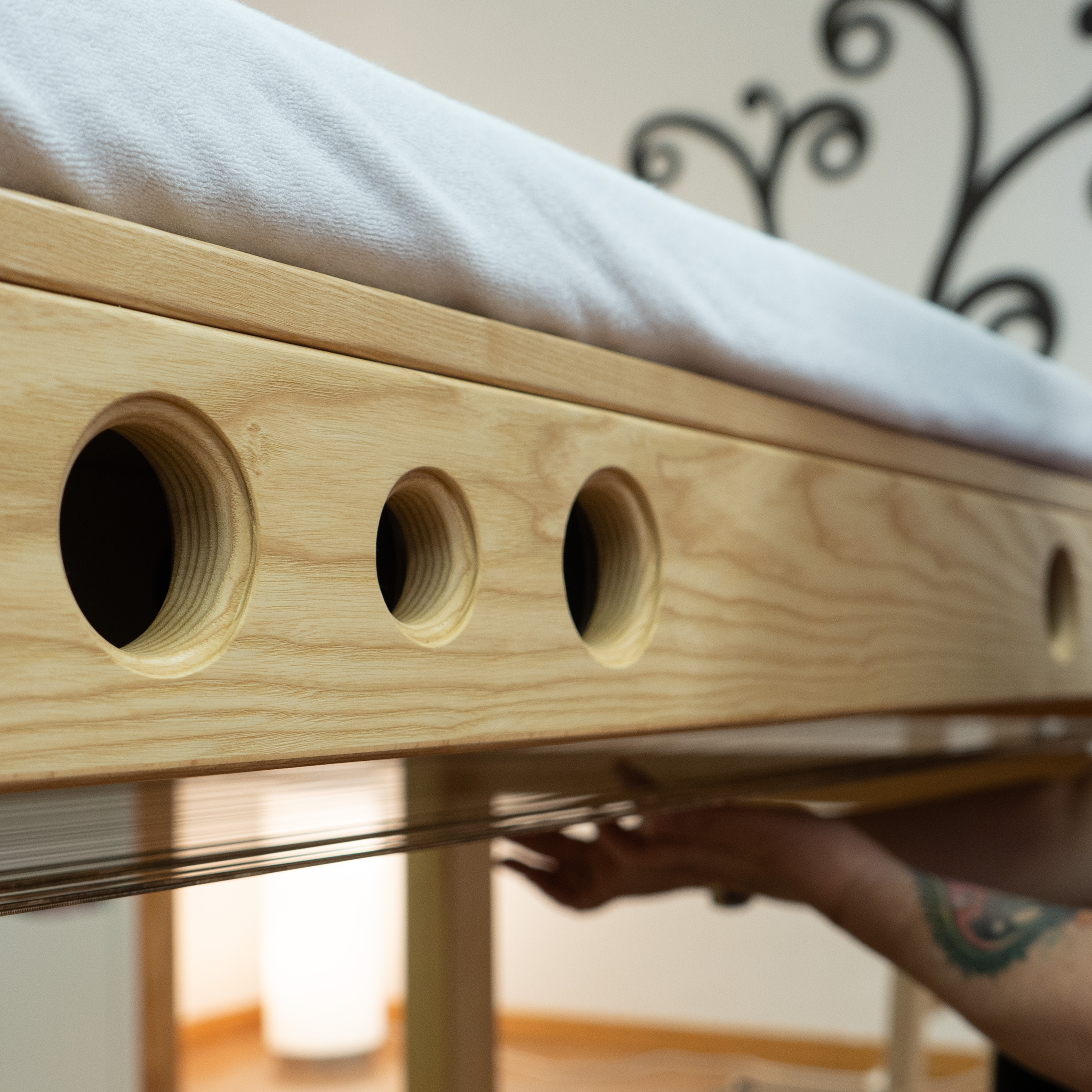 Erleben Sie die faszinierende Welt der Klangheilung auf meiner Monochord-Klangliege. Hier können Sie sich bekleidet und bequem niederlassen, während die sanften Berührungen der Saiten unter der Liege Ihre Sinne verzaubern. Spüren Sie die wohltuenden Vibrationen, die sich wie ein harmonischer Teppich über Ihren gesamten Körper ausbreiten, sowohl über Ihr Gehör als auch durch jede Faser Ihres Seins.
